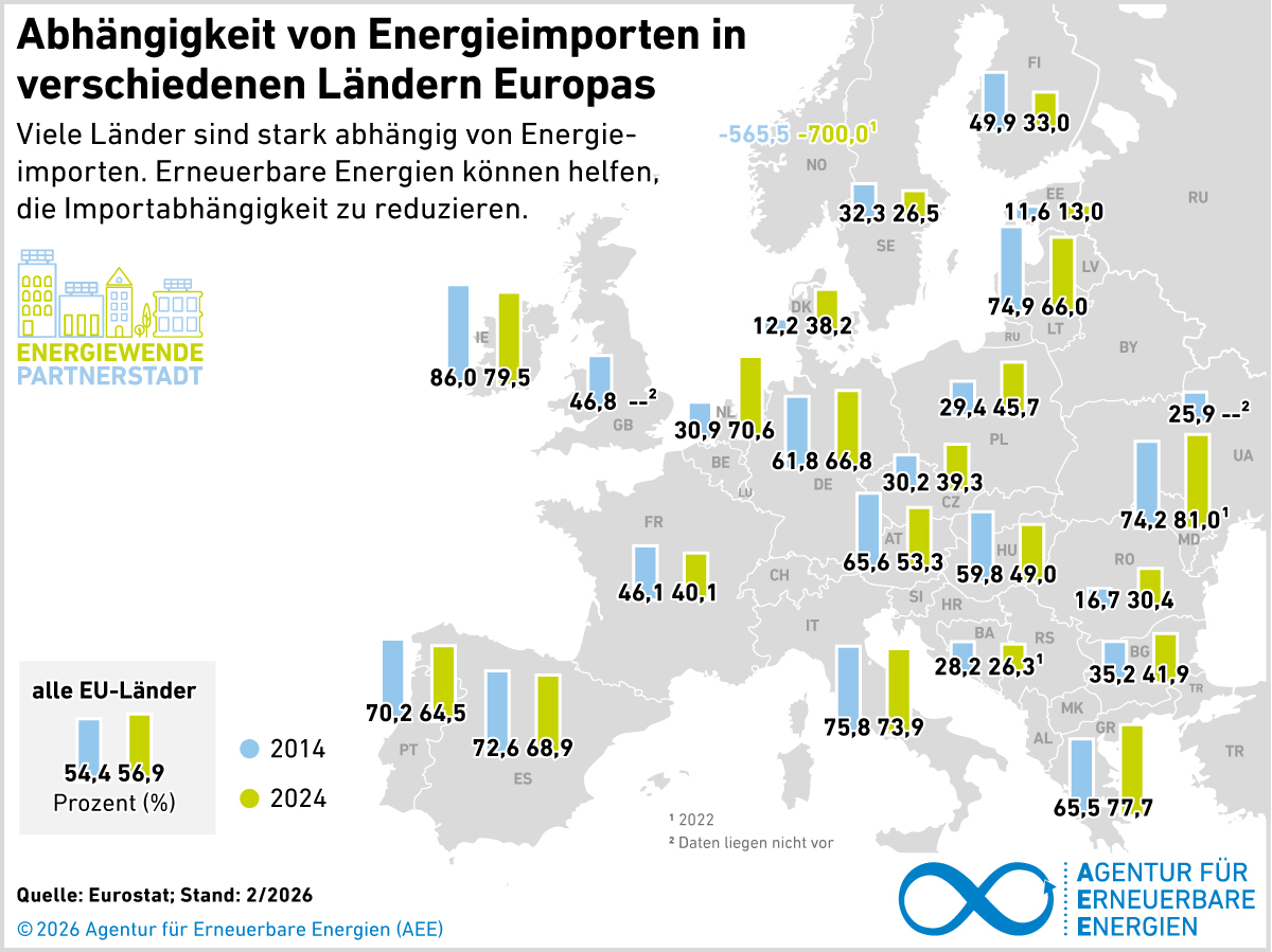 Länder außerhalb der EU wie Bosnien und Herzegowina oder die Republik Moldau weisen sehr unterschiedliche Abhängigkeiten von Energieimporten auf. Um die Unabhängigkeit von Energieimporten zu stärken und damit auch unabhängiger von der Politik in Ländern wie den USA, Russland oder Saudi-Arabien zu werden, helfen nur der Ausbau inländischer Kapazitäten zur Nutzung Erneuerbarer Energien und die Verringerung des Energiebedarfs.