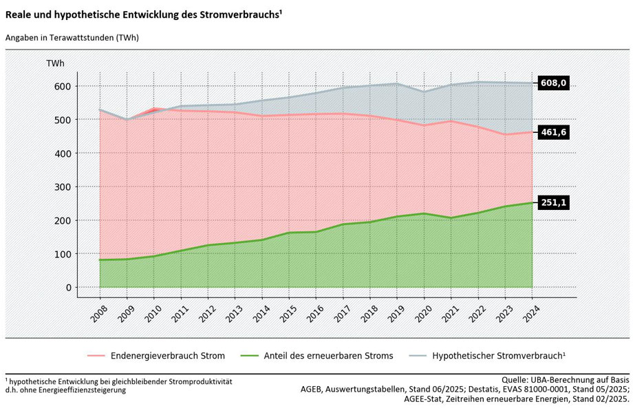 Stromverbrauch wäre ohne Energieeffizienz ein Drittel höher, Erneuerbaren-Anteil deutlich niedriger