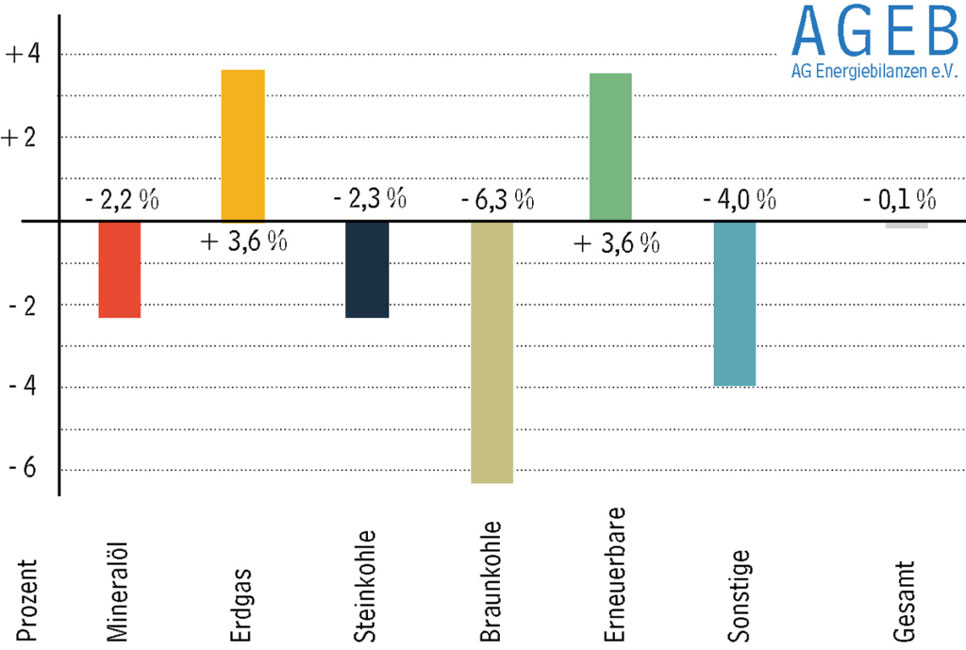Im nationalen Energieträgermix konnten die erneuerbaren Energien sowie das Erdgas ihre Anteile im abgelaufenen Jahr ausweiten. Der Erdgasanteil stieg auf 26,9 (Vorjahr: 26,0) Prozent. Die Erneuerbaren erreichten einen Anteil von 20,6 (Vorjahr: 19,8) Prozent. Das Mineralöl verlor leicht und deckte 2025 insgesamt 35,7 (Vorjahr: 36,5) Prozent des Energieverbrauchs in Deutschland. Bei Stein- und Braunkohle kam es erneut zu einem Anteilsverlust auf jeweils rund 7 Prozent.