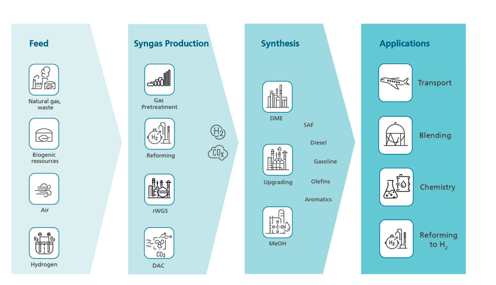Der DME-Markt, der aktuell bereits mehr als 5 Mio Tonnen/Jahr umfasst, wird aufgrund der neuen Anwendungen (z.B. Zumischung in Liquified Petroleum Gas, LPG und Plattformmolekül für Kraftstoffe) um ein Vielfaches wachsen. »Der globale LPG-Markt umfasst etwa 200 Millionen Tonnen pro Jahr. Hinzu kommt unter anderem der Markt zur Herstellung von Sustainable Aviation Fuels, der für das Jahr 2050 auf bis 400 Millionen Tonnen pro Jahr geschätzt wird. Dies zeigt das enorme Potenzial von DME«, erläutert Dr. Achim Schaadt, Abteilungsleiter Nachhaltige Syntheseprodukte.