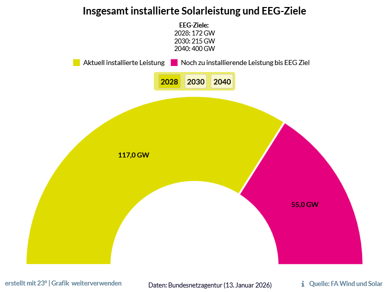Für das Jahr 2028 sieht das EEG eine installierte Solarleistung von 172 GW vor. Derzeit sind davon rund zwei Drittel realisiert. Um das Ziel zu erreichen, müssen bis 2028 Solaranlagen mit einer zusätzlichen Gesamtleistung von 55 GW errichtet werden.