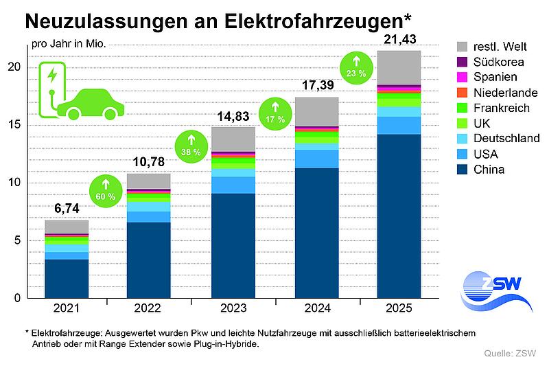 Das Marktwachstum für Elektrofahrzeuge hat 2025 wieder Fahrt aufgenommen: Weltweit wurden 21,4 Millionen Elektrofahrzeuge neu zugelassen. Dies ist ein Plus von 23 Prozent gegenüber dem Vorjahr.