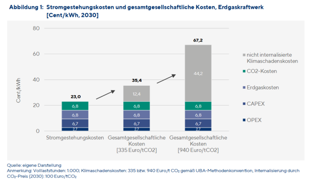 Die Studie beziffert die gesamtgesellschaftlichen Kosten eines neuen Gaskraftwerks auf bis zu 67 Cent pro Kilowattstunde. Die reinen Stromgestehungskosten betragen je nach CO2-Preis zwischen 23 und 28 Cent/kWh. Zum Vergleich: Strom aus neuen Wind‑ und Solaranlagen liegt dagegen bei unter zehn Cent. Zusätzlich verursacht Strom aus Erdgas erhebliche gesellschaftliche Kosten – von Klimaschäden durch CO₂‑ und Methanemissionen über staatliche Subventionen bis hin zu Krisenkosten und langfristigen Abhängigkeiten von fossilen Importen. Diese Kosten werden von der Allgemeinheit und künftige Generationen getragen.