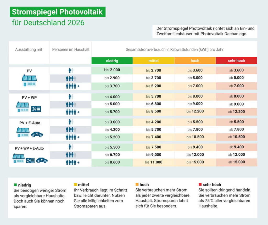Der Stromspiegel Photovoltaik richtet sich an Hauseigentümer, die ihren Stromverbrauch besser verstehen und optimieren möchten. Wer weiß, ob der eigene Verbrauch gering, mittel oder hoch ist, kann gezielt nach Stromfressern suchen oder den Eigenverbrauch effizienter gestalten.