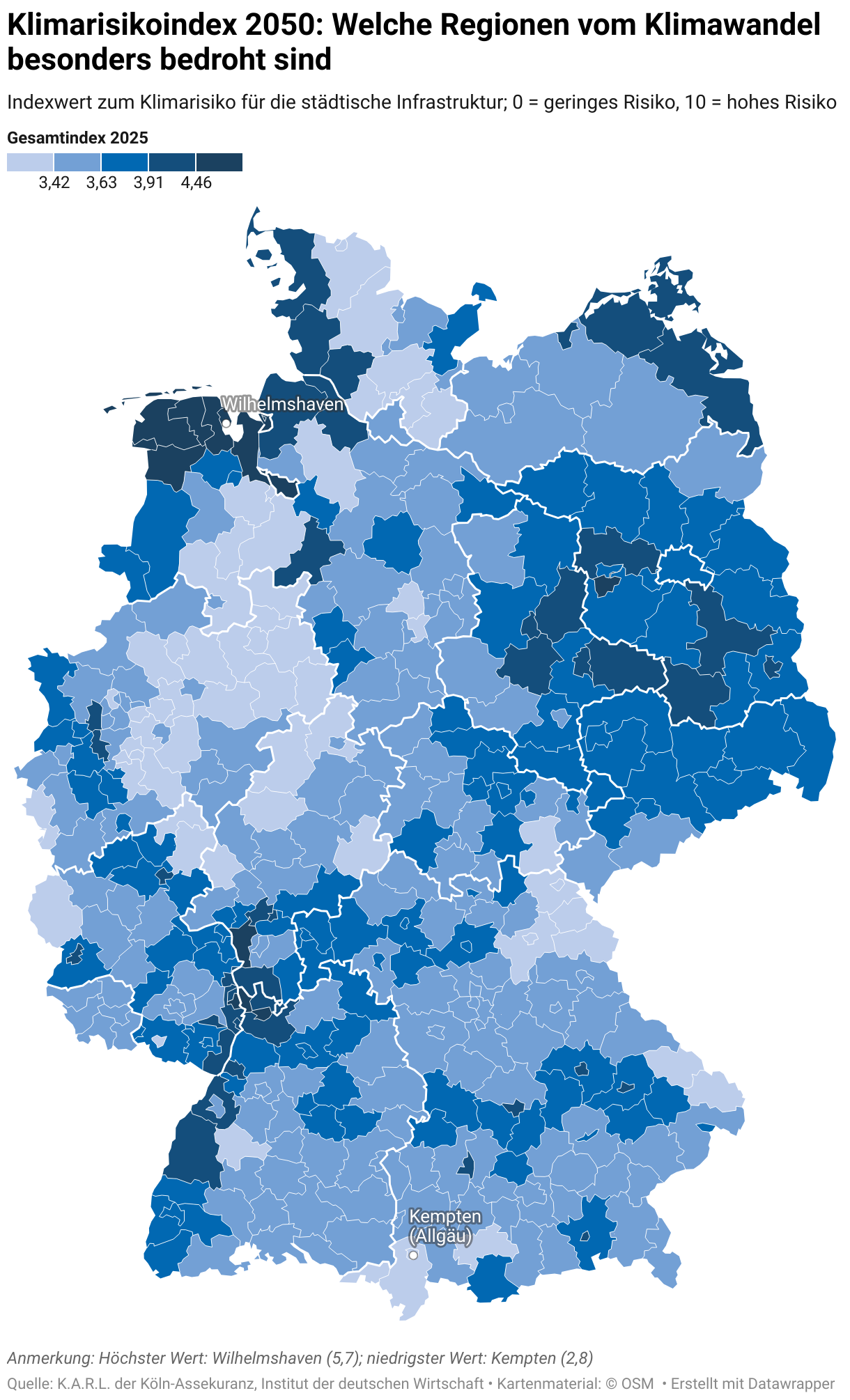 Die größten Klimarisiken für die städtische Infrastruktur herrschen in Wilhelmshaven. Das spiegelt sich im Index wider: Wilhelmshaven liegt aktuell bei 5,7 und steigt bis 2050 auf 5,9 – der höchste Wert aller untersuchten Regionen. Am geringsten fallen die Risiken in Kempten im Allgäu aus: Kempten steigt von 2,8 auf 3,1. Zwar nimmt dort das Risiko für Starkregen deutlich zu, insgesamt bleiben die Risiken jedoch – heute wie 2050 – vergleichsweise niedrig.