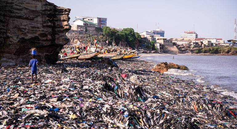 Ghana ist eines der Hauptexportziele für deutschen Textilmüll. Wöchentlich erreichen rund 15 Millionen gebrauchte Kleidungsstücke aus der ganzen Welt die Häfen Ghanas – und zunehmend auch neuwertige, ungetragene Ware, die besonders durch Konsumspitzen wie den Black Friday entsteht. Bei solchen durch Rabattaktionen ausgelöste Spontankäufen werden in Deutschland schon rund 80 Prozent der Textilien ungetragen zurückgeschickt. Diese Masse an Retouren, Überproduktion und Altkleider in zunehmend schlechter Qualität können auch in Ghana nur zum Teil weiterverkauft werden, bereits 40 Prozent der importierten Textilien gelten hier als Müll. Dieser Textilmüll unbekannter Zusammensetzung kann weder in Deutschland noch in Ghana sortenrein sortiert oder gar recycelt werden. Deswegen landet er auf Deponien oder wird verbrannt.