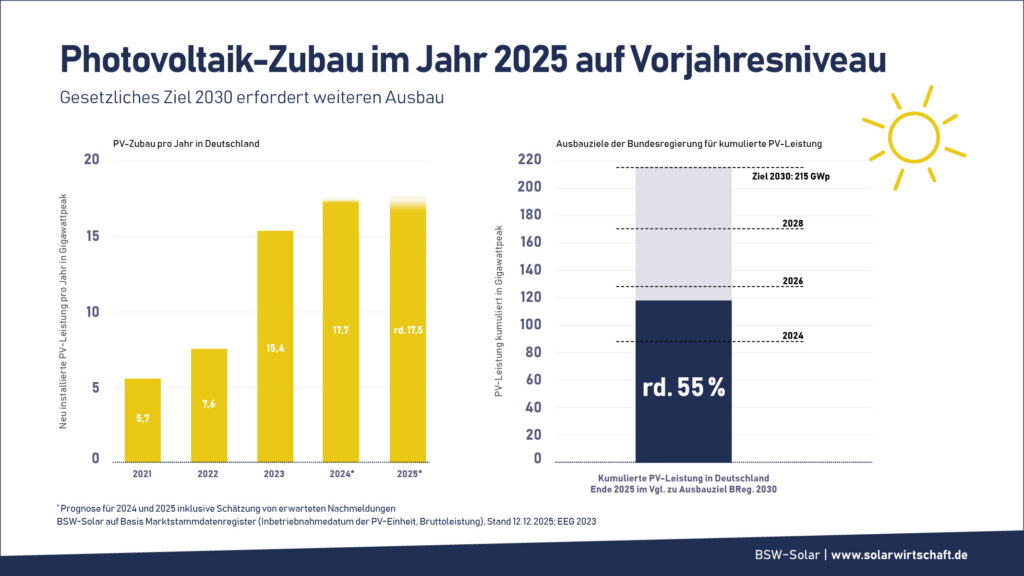 So sei die die Stromerzeugung aus Photovoltaikanlagen zwar deutlich gestiegen, das solare Ausbautempo habe sich aber 2025 entschleunigt. Nach Verbandsangaben wurden vorläufigen Prognosen nach im Jahr 2025 neue Solarstromanlagen mit einer Leistung von rund 17,5 Gigawattpeak (GWp) in Deutschland neu in Betrieb genommen. Die neu installierte Photovoltaikleistung liegt damit in etwa auf Vorjahresniveau (17,7 GWp).