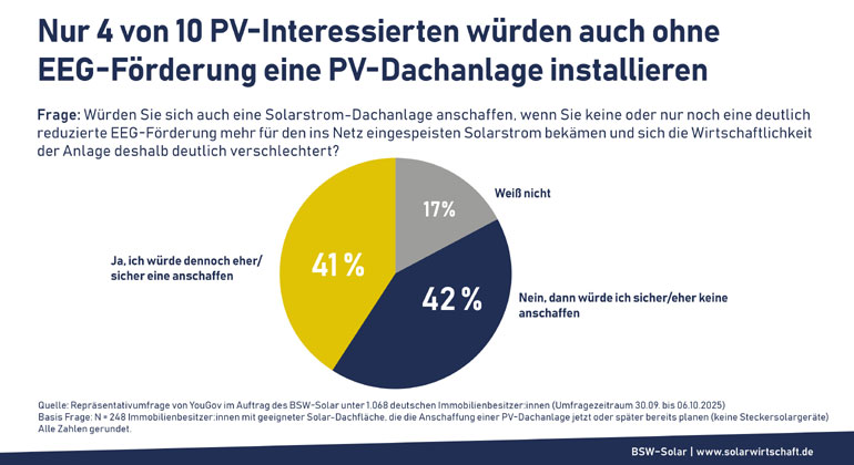Eine Umfrage des BSW-Solar unter 132 Installationsbetrieben Ende letzten Jahres ergab, dass deren Einschätzung nach nur rund 4 von 10 Kund:innen im PV-Heimsegment auch ohne EEG-Förderung eine PV-Dachanlage anschaffen würden. Diese Einschätzung bestätigen jüngst Immobilienbesitzer:innen in einer YouGov-Repräsentativbefragung im BSW-Auftrag: Von 248 befragten Immobilienbesitzer:innen, die die Anschaffung einer PV-Dachanlage bereits planen, würden sich nur rund 4 von 10 (eher) auch bei wegfallender oder deutlich reduzierter EEG-Förderung weiterhin für den Kauf entscheiden. Ganz sicher würden laut der Umfrage in diesem Fall nur noch rund 12 Prozent eine PV-Dachanlage installieren.