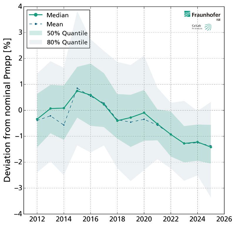 Die Relevanz einer unabhängigen Leistungsüberprüfung für PV-Module ist in den letzten Jahren gestiegen. Seit 2017 wächst die Diskrepanz zwischen der Leistungsangabe vieler PV-Modulhersteller und den Messergebnissen des Fraunhofer ISE und stieg im Jahr 2025 auf eine negative Abweichung von im Median 1,4 Prozent. Ein Forschungsteam des Fraunhofer ISE hatte dafür über 70.000 Leistungsmessungen an Photovoltaik-Modulen ausgewertet, die im Kalibrierlabor des Instituts, CalLab PV Modules, seit 2012 durchgeführt wurden.