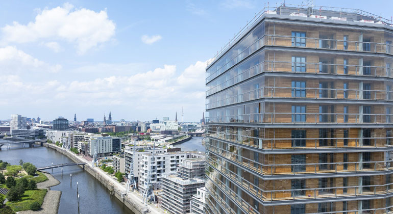Bezahlbarer und zugleich attraktiver Wohnraum wird nach den Worten von DBU-Generalsekretär Alexander Bonde immer mehr benötigt. Gleichzeitig müsse sich die Baubranche für die Folgen des Klimawandels wappnen und Nachhaltigkeit umsetzen. „Hier kann das Bauen mit Holz eine zukunftsfähige Alternative sein“, so Bonde. „Wir brauchen Modellprojekte, die bei Gebäuden aus Holz Wirtschaftlichkeit und Umweltschutz in sich vereinen.“. Ein Beispiel findet sich in der Hamburger Hafencity: das von der DBU geförderte Projekt „roots“ – ein rund 64 Meter-Hochhaus mit 128 Wohnungen, Büroräumen, einer Ausstellung sowie 53 geförderten Wohnungen in einem angeschlossenen Wohnblock ebenfalls in Holzbauweise. Bei dem von der Garbe Urban Real Estate Germany GmbH & Co. KG errichteten Hochhaus bestehen alle tragenden Elemente aus Holz, ergänzt durch einen Treppenhauskern aus Stahlbeton für den Brandschutz.