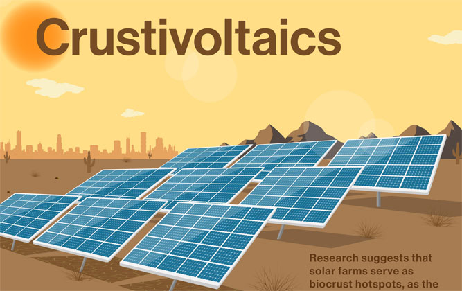 In a proof-of-concept study, ASU researchers adapted a suburban solar farm in the lower Sonoran Desert as an experimental breeding ground for biocrust. During the three-year study, photovoltaic panels promoted biocrust formation, doubling biocrust biomass and tripling biocrust cover compared with open areas with similar soil characteristics.